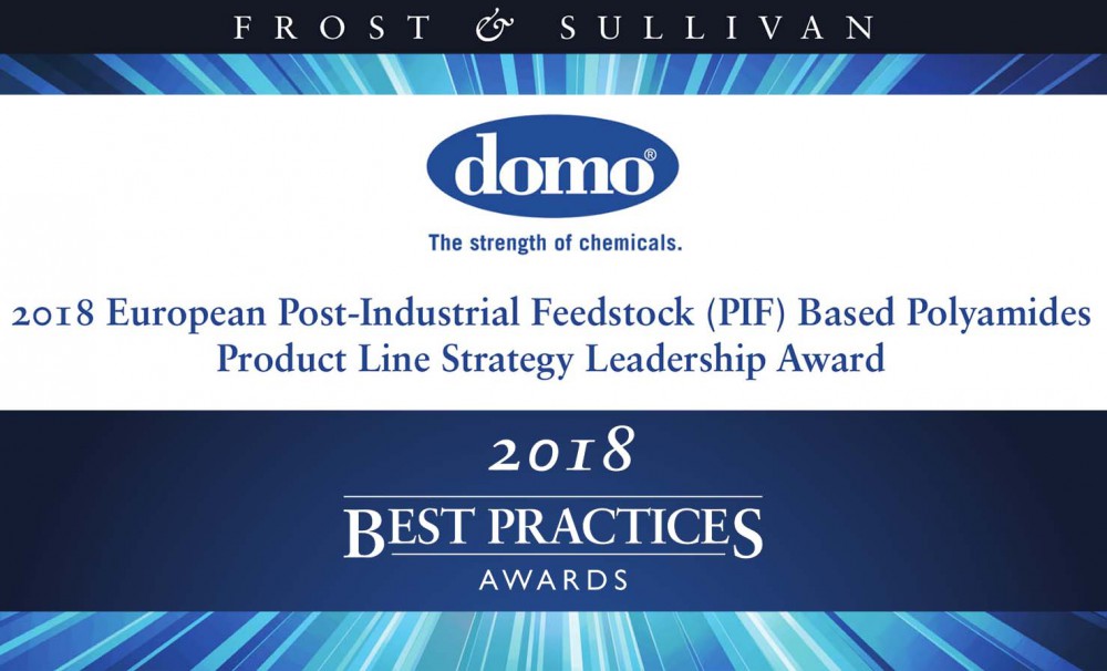 LONDON, U.K. — February 26th — Based on its recent analysis of the European post-industrial feedstock (PIF)-based polyamides market, Frost & Sullivan recognises DOMO Chemicals with the 2018 European Product Line Strategy Leadership Award. The company is established as a prominent solution provider in the market, offering both conventional and sustainable polyamide resin grades for diverse applications. The company’s cost-effective polyamides are the optimum solutions in a market challenged by increasingly stringent policies and regulations governing greenhouse gas emissions, energy consumption, and the generation, handling, and disposal of waste.